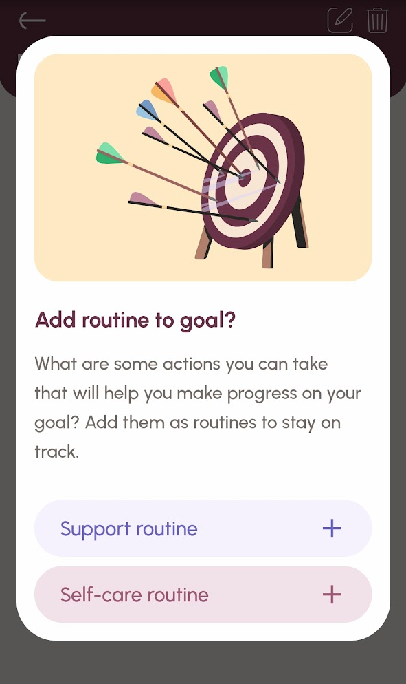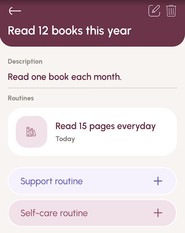 4. Next, you'll be asked to create supporting routines to help you reach your goal. In our example here, we want to read 12 books this year, so let's set up a daily reading self-care routine to help keep us on track.