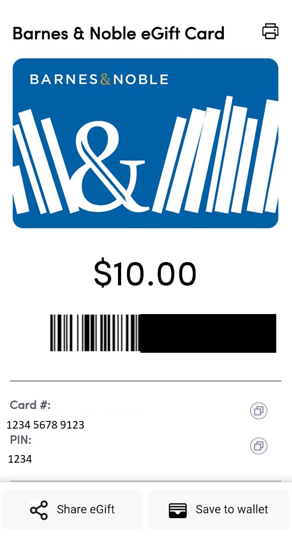 - You will be directed to a website with the bar code to redeem in store, as well as the gift card number and PIN to redeem online. You can also save it to your device's wallet to use later.