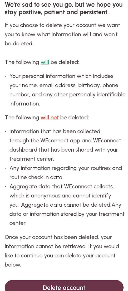 Tap the 'Delete account' button to confirm that you wish to permanently remove your WEconnect account.